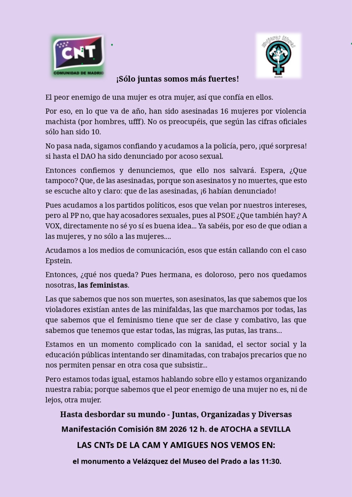 CULTURA Sin categoría SINDICAL SOCIAL Solo juntas somos mas fuertes cntaranjuez 6 de marzo de 2026 cntculturaeducaciónFEMINISMOrepresiónsindicalismosolidaridad
