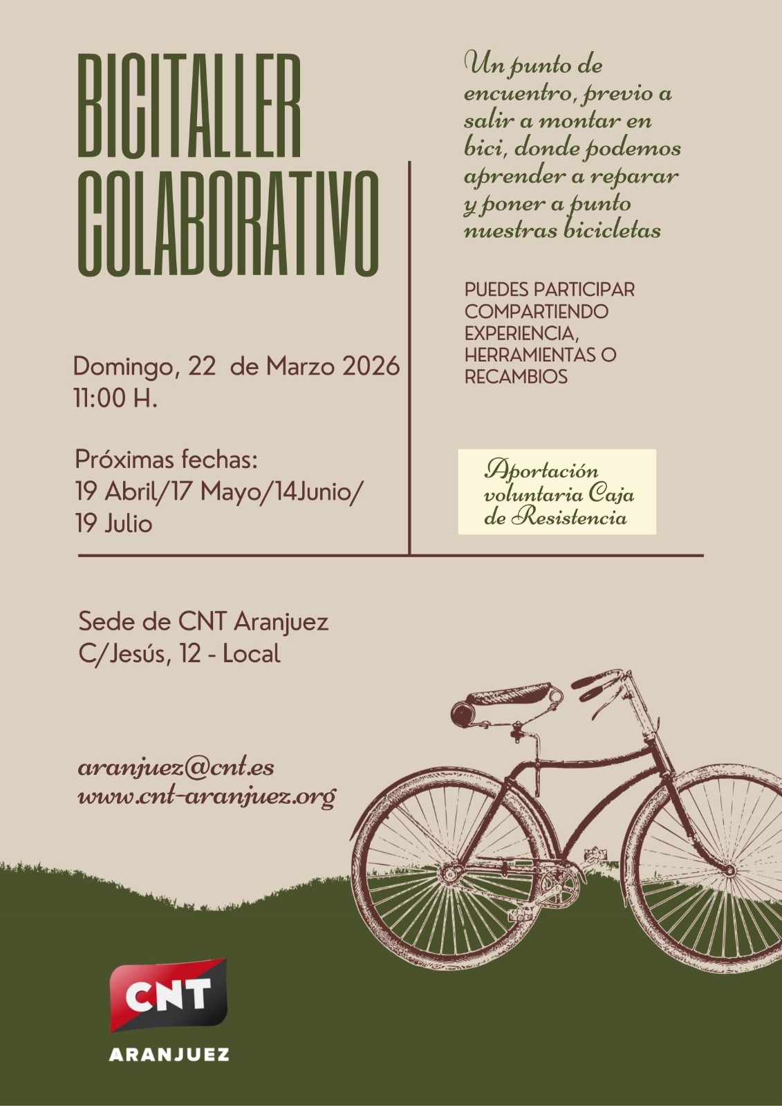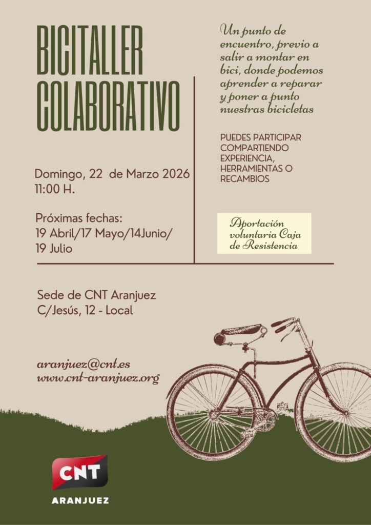 Desde CNT Aranjuez proponemos un proyecto que encaja en este movimiento. Lo llamamos Bici-taller Colaborativo. Le iremos dando contenido en la medida que las personas se sumen y vengan con sus bicicletas. Este proyecto se inicia con el espacio cedido por CNT Aranjuez, la asistencia de una persona con conocimientos de mecánica de bicicletas, la disponibilidad de herramienta especializada y re-cambios básicos.