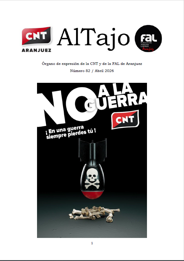 Salud! Llega el nuevo número de la revista mensual, un ALTAJO de abril de 2026 cargado de contenidos que no te puedes perder. Desde nuestra portada con un cartel confederal contra la guerra, tenemos también las reivindicaciones de la Plataforma Laboral de Escuelas Infantiles que van a la huelga a partir del día 7 de abril en la Comunidad de Madrid y traemos además el avance de lo que va a ser el eventazo del 1º de mayo, La clase obrera del mundo contra la guerra y el genocidio, que tendrá lugar el domingo 26 de abril con concierto, comida para recaudar fondos para la caja de resistencia de CNT Aranjuez y la participación de otros colectivos.