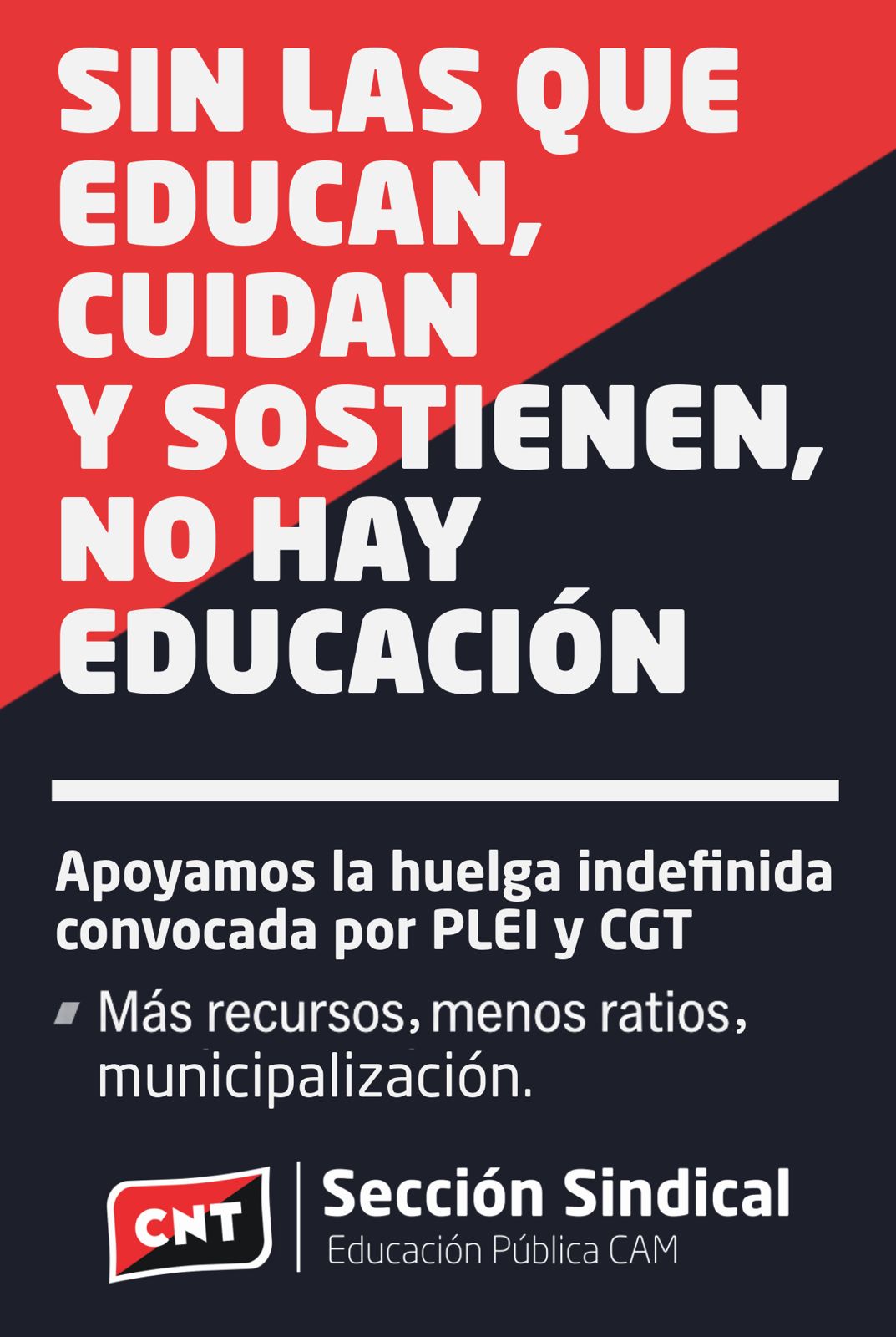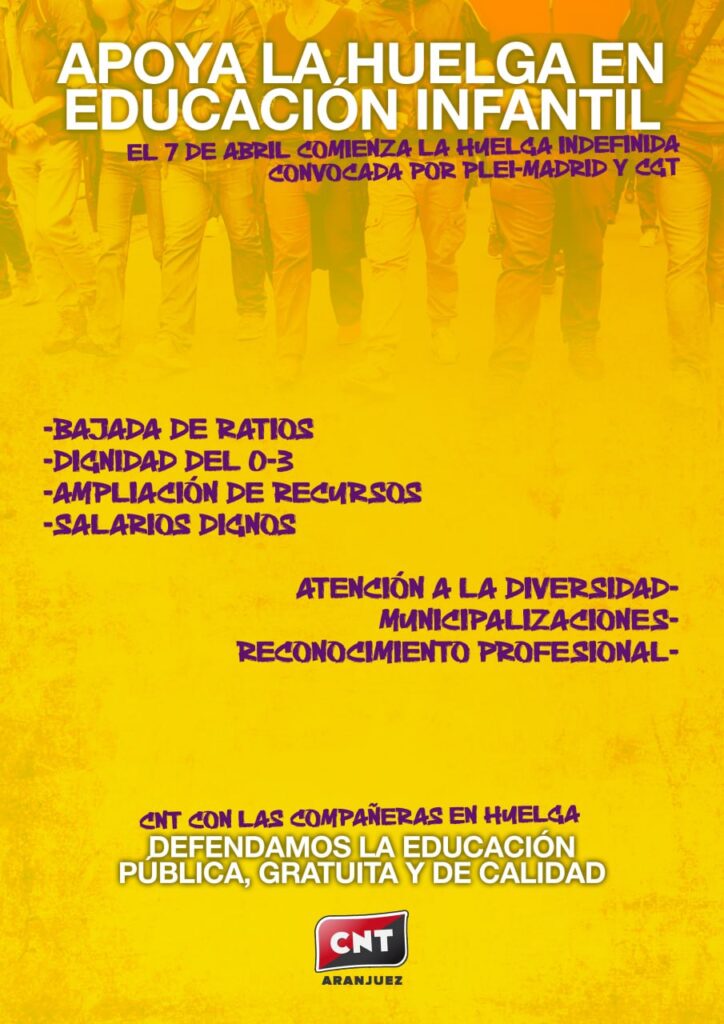 El sector de la Educación Infantil de 0 a 3 años están en huelga indefinida desde el 7 de abril, convocadas por la Plataforma Laboral de Escuelas Infantiles (PLEI) y el sindicato de la Confederación General del Trabajo (CGT). Las reivindicaciones van dirigidas tanto al Ministerio de Educación, Ciencia y Deporte como a la Consejería de Educación de la Comunidad de Madrid.