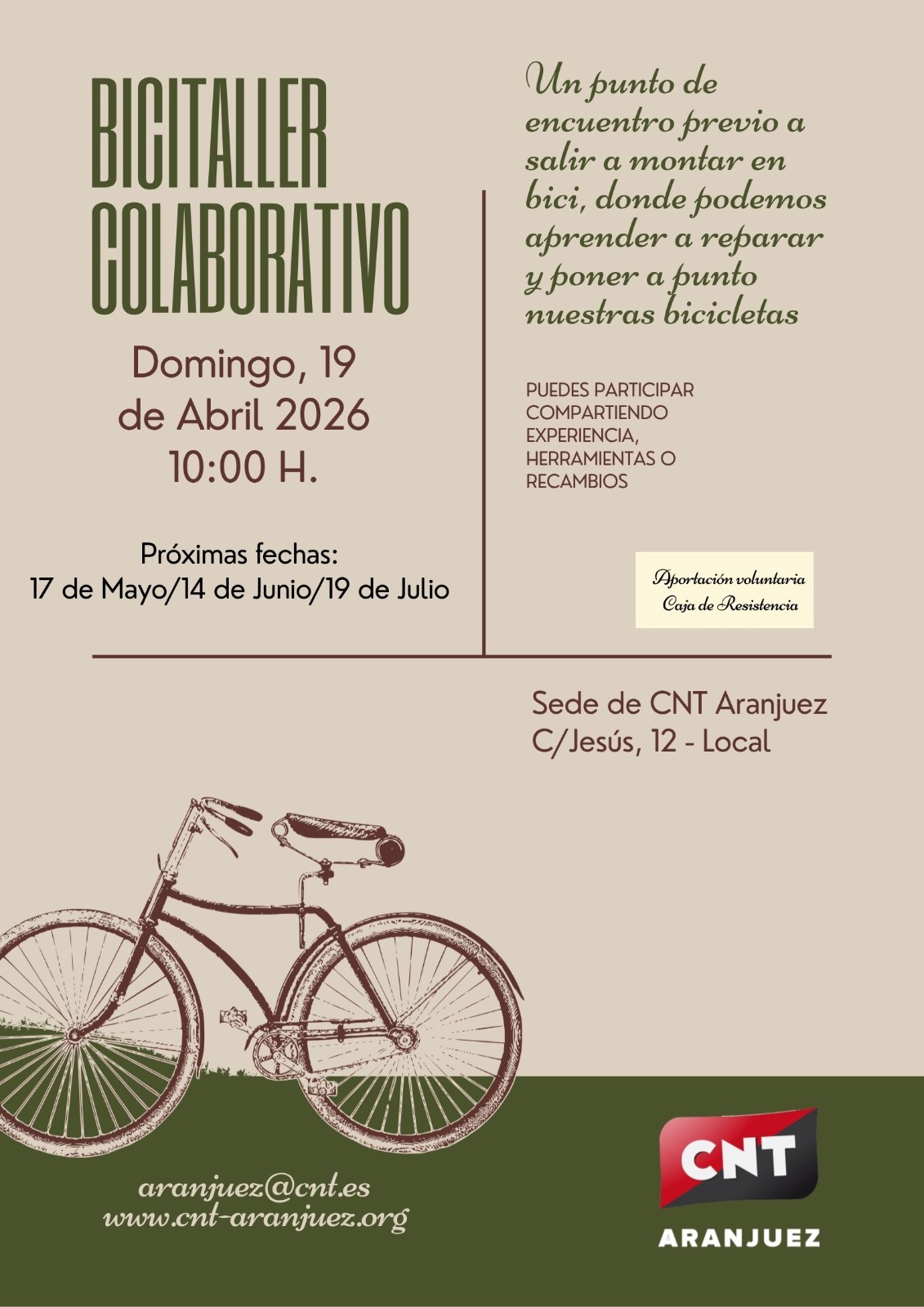 GALERÍA SOCIAL Bicitaller colaborativo el 19 de abril del 2026 cntaranjuez 13 de abril de 2026 educaciónsolidaridad